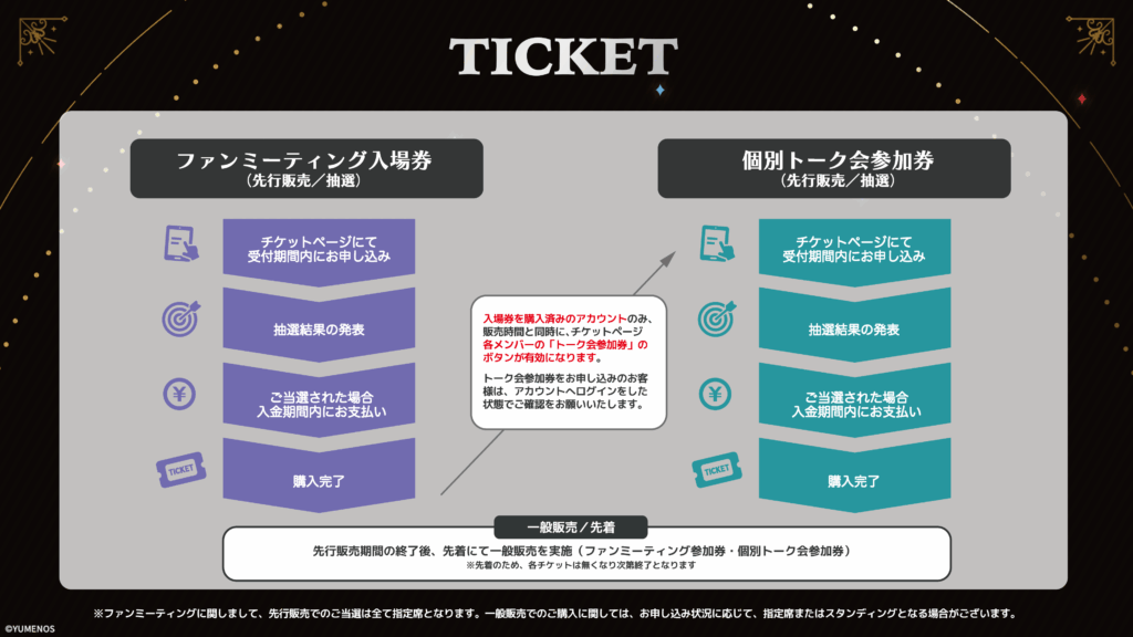 ・ファンミーティング入場券にご当選された方は、チケットの入金後、受付開始日よりご希望メンバーの[個別トーク会参加券]をお申し込みいただけます。